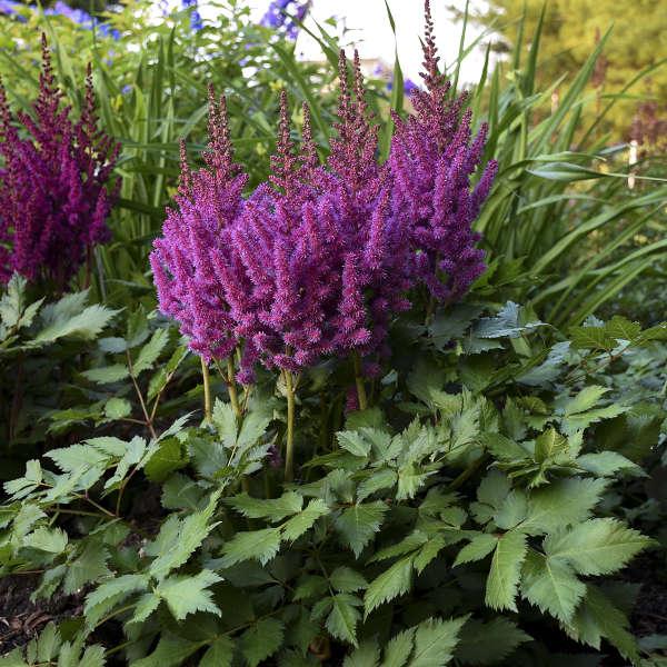 Little Vision in Purple’ differs from ‘Visions’ by its more compact plant habit, more finely dissected leaves, and darker colored flowers. These flowers form a dense block of fuzzy, pyramidal shaped, lavender plumes, presented just above the coarsely textured, dark green foliage in midsummer. Like all Astilbe chinensis types, this one exhibits a bit greater tolerance to drier soils and can tolerate full sun.