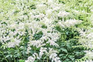 Soft white flower plumes float above lacy green foliage in midsummer. The delicate, deep green leaves add ferny texture to garden beds long after the blooms have faded. Mass astilbe in groups in partly shaded gardens for maximum colour and impact.