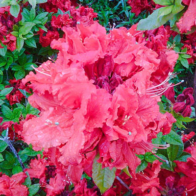 With radiant flowers that are just as welcome in a tropical oasis as they are in an English cottage garden, Red Demon delivers bright, gorgeous color on a winter-hardy plant. Two-tone blooms are awash in rich color that adds depth and beauty to butterfly gardens or borders. This particular cultivar is a very strong pollinator lure, urging butterflies and bees by the hundreds to visit the landscape during the long mid spring to early summer bloom time. Plus, Red Demon boasts a longer lifespan compared to other azaleas. Planted in groups, it makes a fine flowering hedgerow or privacy screen, growing to 4 feet tall with a 5 foot spread. Rhododendron 'Red Demon'