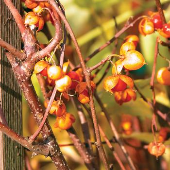Insignificant small greenish-yellow flowers, spherical berries are green when young and ripen to yellow in the fall. The berries split open to reveal an orange-red seed surrounded by a yellow skin. Leaves turn a vibrant yellow in the fall. **A male plant is needed for fruit to set**. Berries are widely used in the floral industry, drought tolerant, twining vine.