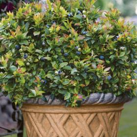 Great for landscaping and in patio pots. Foliage is light green with red tips throughout the growing season. Transitions to yellow and red in the fall. Compact, half-high bush produces bumper crops of sweet, flavorful blueberries. Grows well in containers! Cold hardy. Ripens in late July to early August. Self-pollinating.