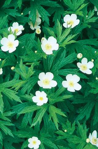 Pure white single flowers signal springtime's arrival. Vigorous perennial plant with deeply lobed foliage spreads readily via underground stems. Prefers and grows fastest in moist areas; perfect near ponds and for mass plantings.