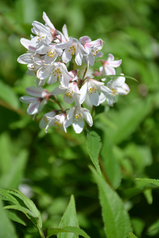 Yuki Snowflake® Deutzia is covered in stunning racemes of white cup-shaped flowers with buttery yellow anthers at the ends of the branches from mid to late spring. It has dark green foliage throughout the season. The serrated pointy leaves turn an outstanding burgundy in the fall. The fruit is not ornamentally significant.