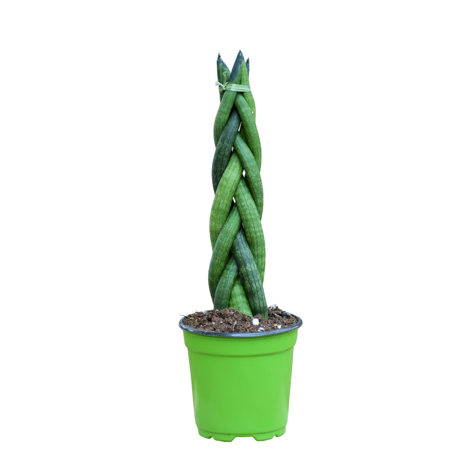 Indeed a one-of-a-kind ornamental plant, this Sansevieria presents beautiful foliage that has been braided together. The smooth, elongated, striped, and greenish-gray leaves fan out as they mature, only making this unique and striking succulent more appealing. Grow this Snake Plant in bright light, and it will give you a lovely bloom of a pink-budded white flower.